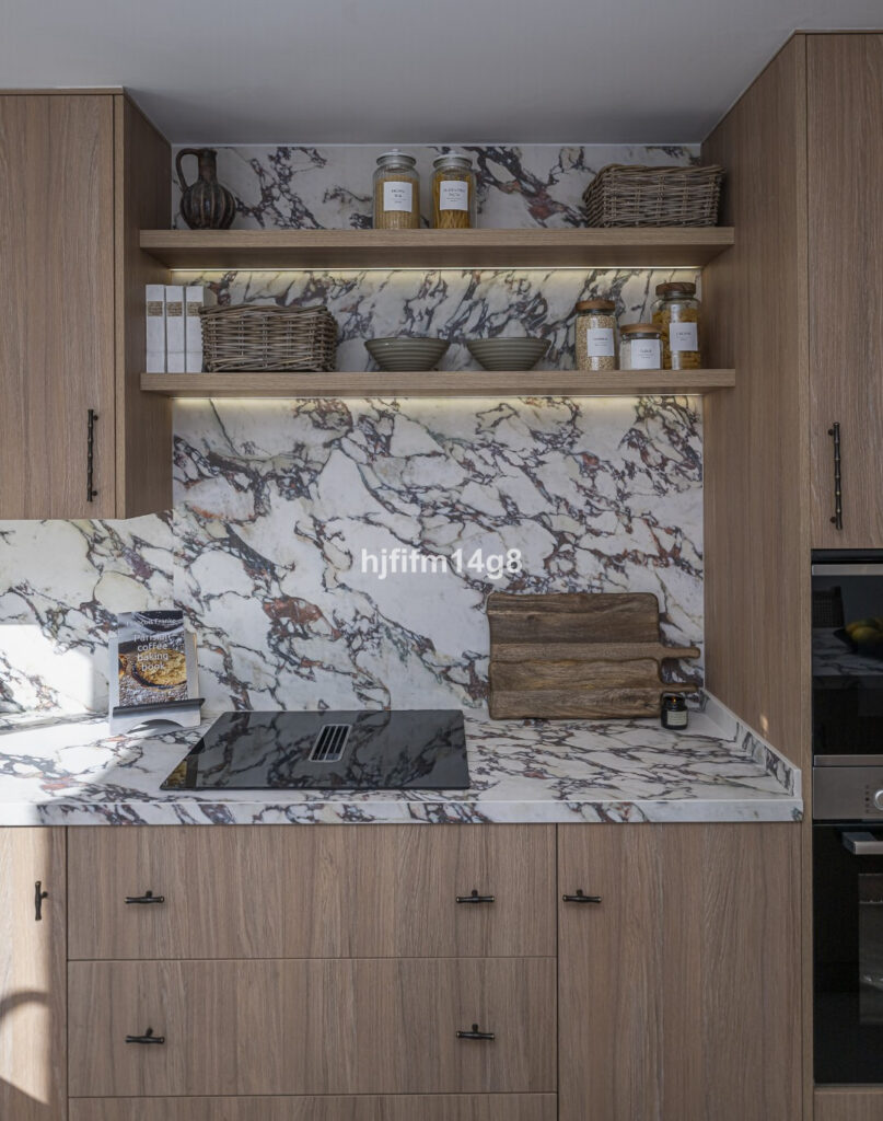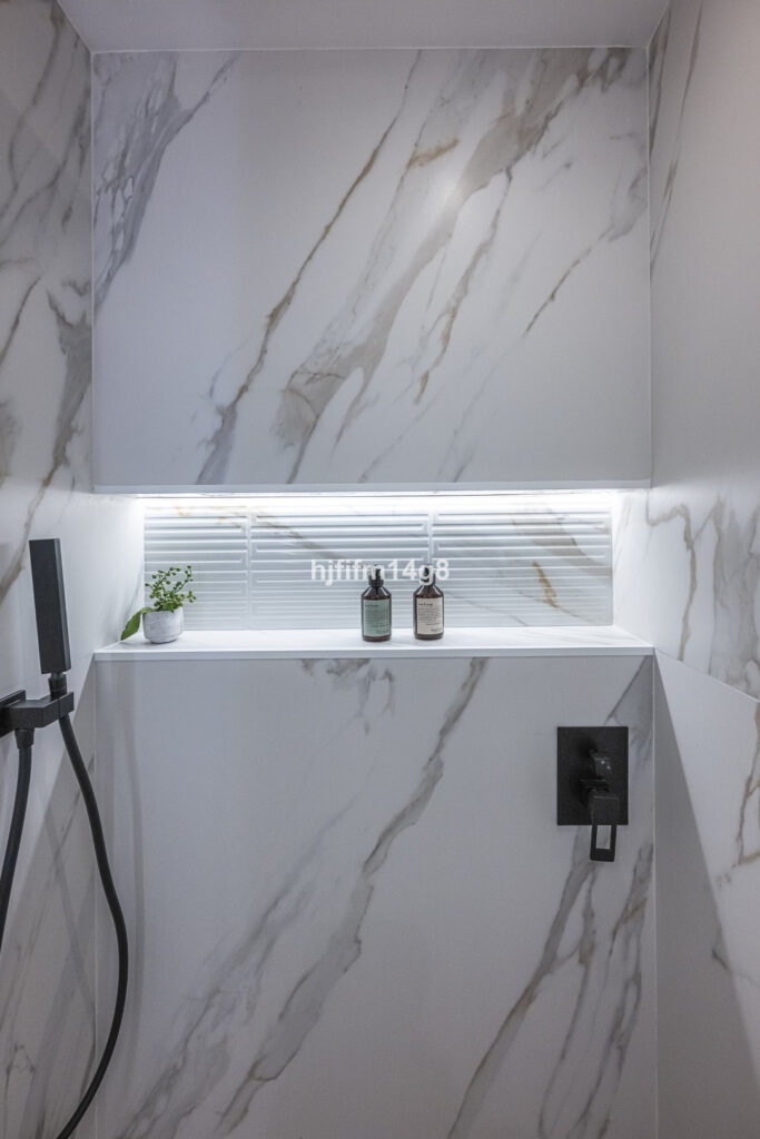 The upper floor hosts an elegant master bedroom with en-suite bathroom and a guest bedroom also with its own en-suite bathroom. These spaces feature custom-made wardrobes and bespoke bathroom vanities, with refined finishes including travertine bedside tables in the bedroom opposite the master suite. All bathrooms are fitted with XXL format tiles, while the guest toilet showcases beautiful high-end textured porcelain tiles.