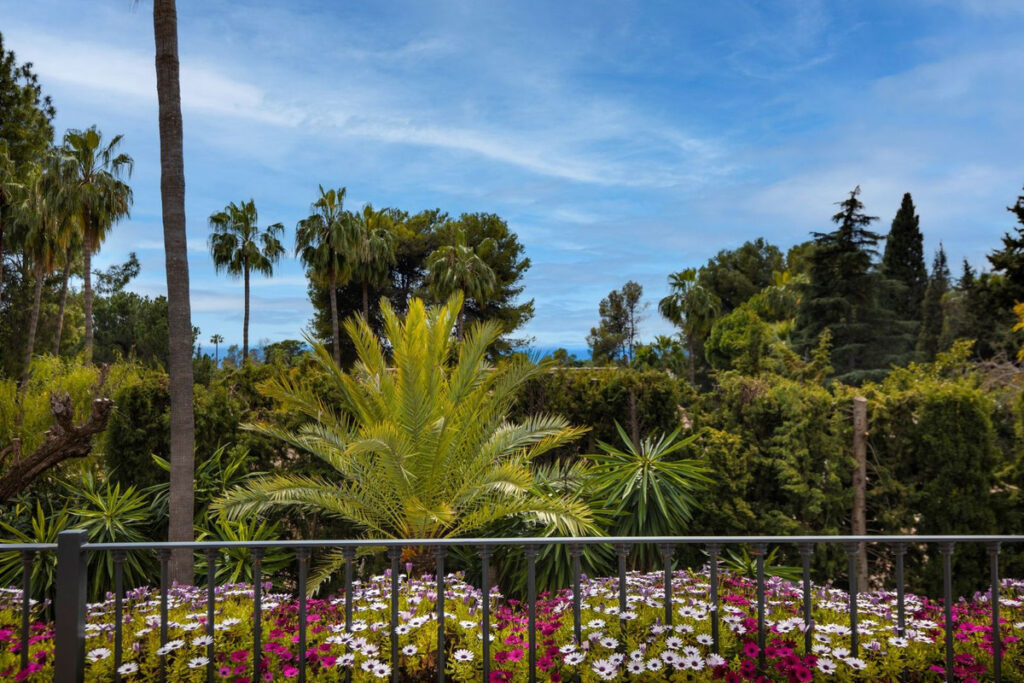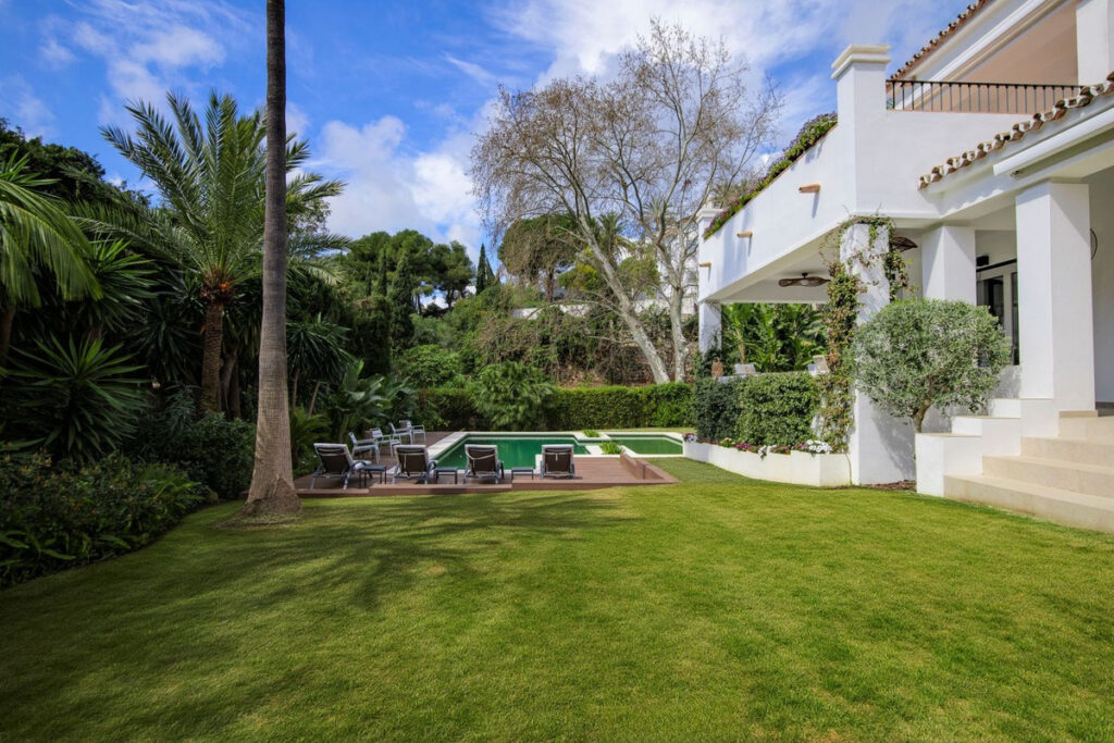 The mature, landscaped garden reinforces privacy and adds depth to the setting. From the upper level, the villa enjoys open views towards the sea and surrounding greenery, while the rooftop solarium offers sweeping 360° views encompassing the Mediterranean, the mountains, and the distinctive landscape of Sierra Blanca.