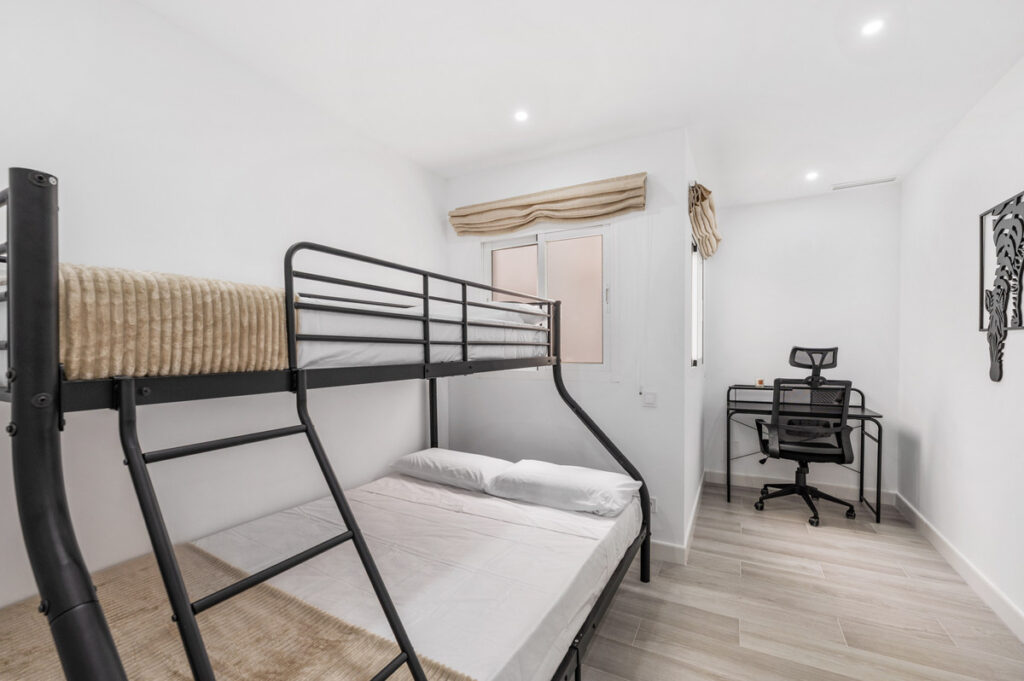 Inside, the apartment features a bright, updated interior with a practical layout. The entrance hall leads into a modernised kitchen, followed by a well-proportioned bedroom. The master suite includes its own bathroom and direct access to the terrace. The living and dining area is comfortable and well laid out, with sliding doors opening onto the terrace.